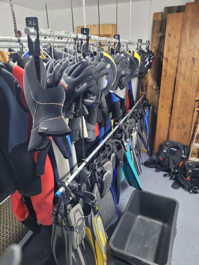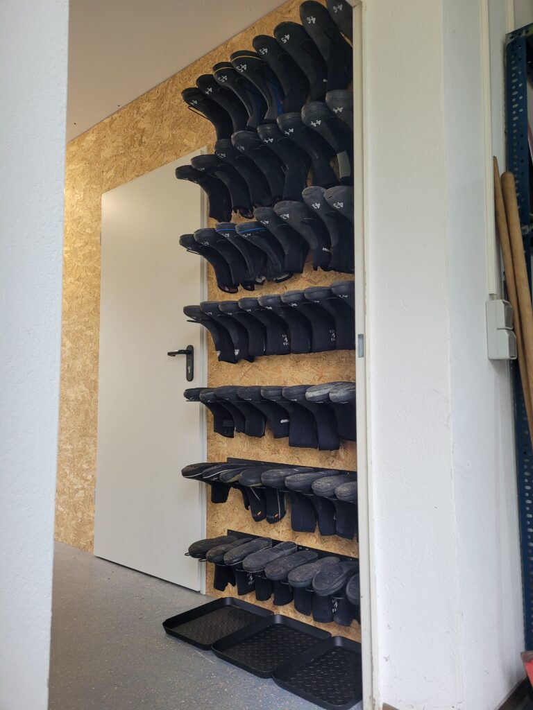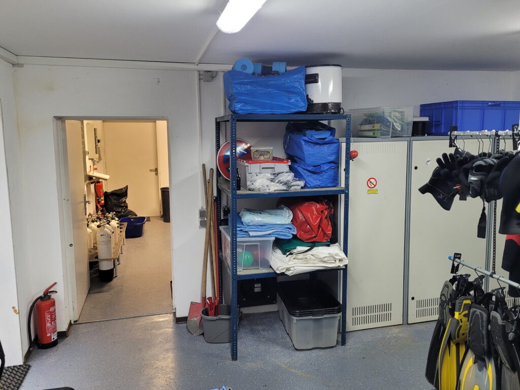 Die Füßlinge befinden sich nun nach Größe sortiert in einem Regalsystem neben der Tür zum Kompressorraum. Anzüge, Eiswesten, Kopfhauben, Handschuhe und Flossen hängen nun alle mit passenden Aufhängevorrichtungen auf den Stangen, welche mit entsprechenden Größenunterteilungen versehen sind. Am Boden haben wir Auffangwannen für das Tropfwasser aufgestellt.