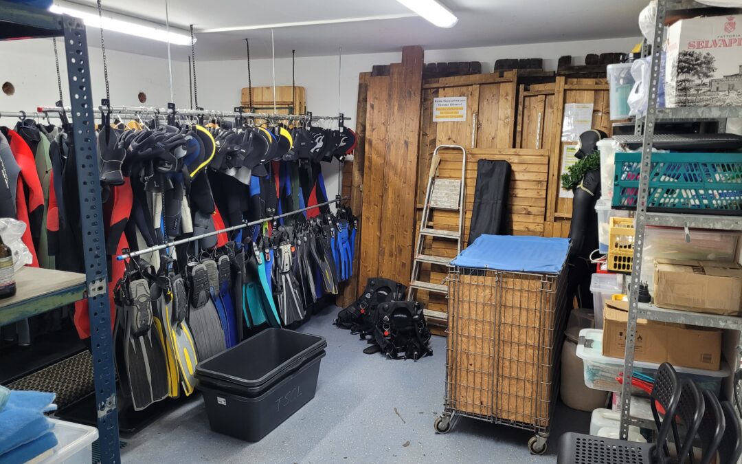 Für die Schwimmbadflossen wollen wir uns ebenfalls noch ein sinnvolles Aufbewahrungssystem ausdenken, so dass die sperrige Gitterbox weg kann. Es sollen noch fünf weitere Mares Reglersätze erworben werden, so dass die Cressis ausgemustert werden können und wir im Resultat acht identische Kaltwassersets mit langem Schlauch haben, welche wir zukünftig dann auch bei der Schwimmbadausbildung einsetzen wollen.